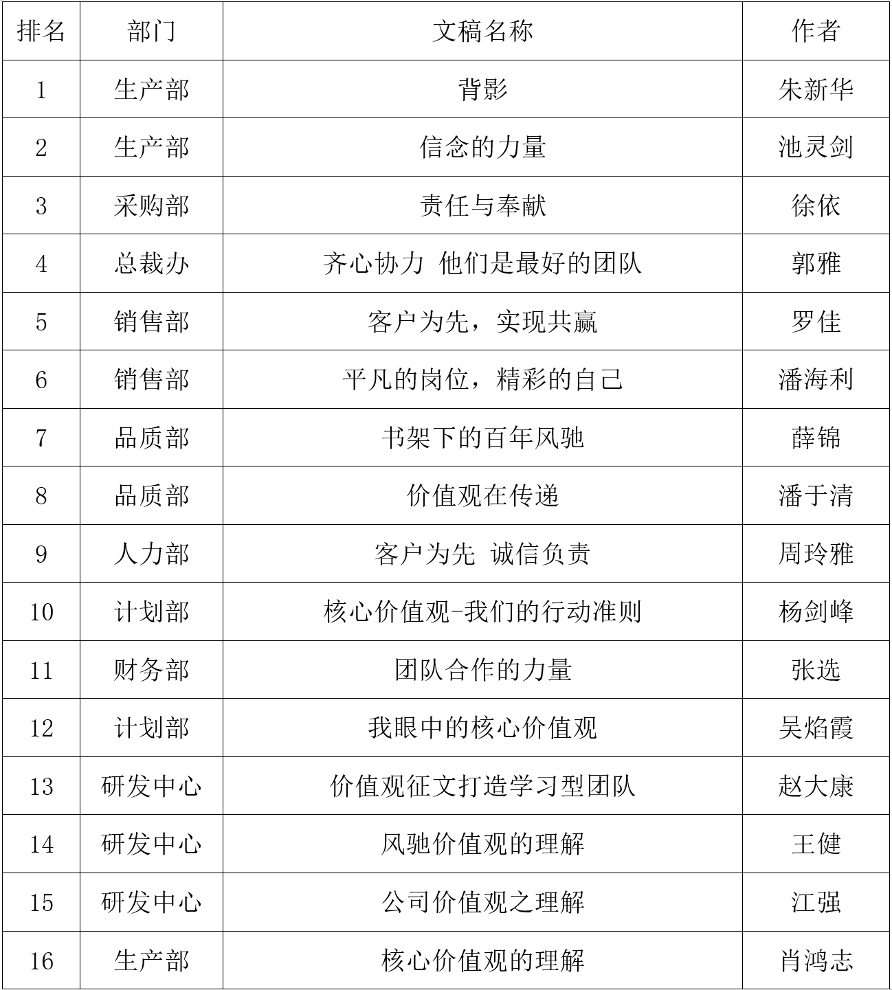 首先,評審組10位評委根據價值觀主題、文稿內容,觀點表達清晰度,事實案例,語言表達流暢,文稿整體結構完整性,幾個方面對稿件進行了認真的打分,再依據分值排名匯總至執行總裁最終審核,得出最終評審結果:生產部朱新華的《背影》一文一舉奪魁,文中沒有華麗的文字,沒有網紅的心靈雞湯,只是簡單的言語,背后卻道出了我們公司的價值觀,平凡崗位上忙碌的背影深深印刻在每位風馳人的心中,文章獲得評委們的一致好評。生產部池靈劍的《信念的力量》立場鮮明,主題突出,讓人感到信念的是一種熱烈的,一種噴薄而出,一種昂揚斗志的力量,喜獲二等獎;采購部徐依的《責任與豐獻》,總裁辦郭雅的《齊心協力,他們是最好的團隊》并列三等獎。